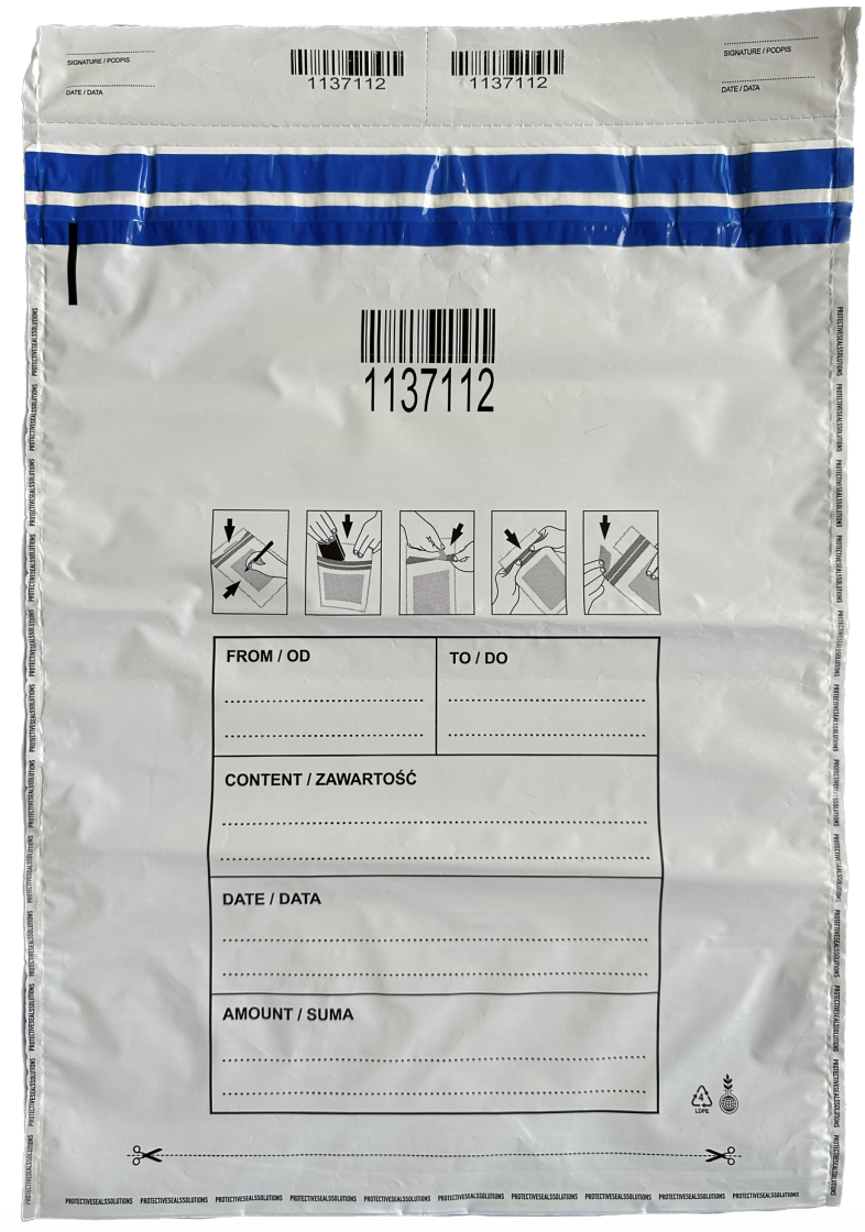 Introducing our Security Bags and Envelopes, the ultimate solution for the secure transportation of your most valuable items, including confidential documents and precious samples. Crafted from high-quality PE LD (Low-Density Polyethylene) recycled film, these envelopes are specifically designed to offer unmatched security and peace of mind.