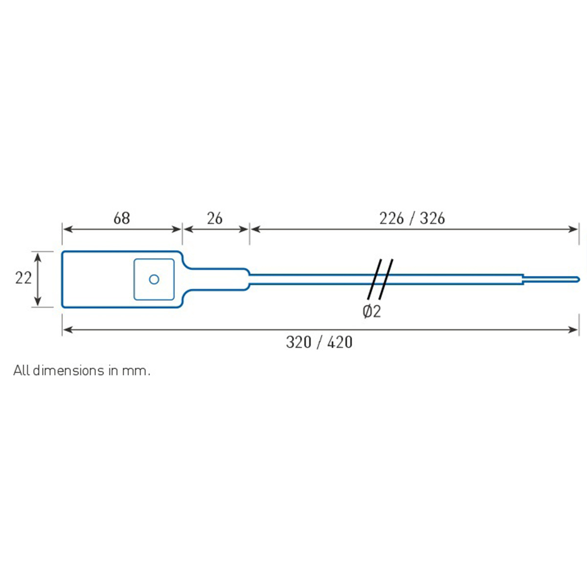 The design of the plastic TRUCKSEAL L security seal resembles a band with an attached wire. They consist of a generous surface for customer customization, known as a tag, and a metal locking mechanism on one side, along with a filament-like plastic wire on the other. Similar to a cinch, the cable forms a loop when inserted into the locking mechanism. They cannot be separated without damaging the cable or closure mechanism, thus revealing any fraudulent manipulation attempt on the protected item.
